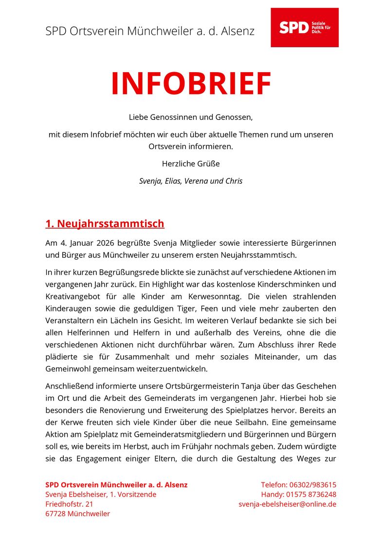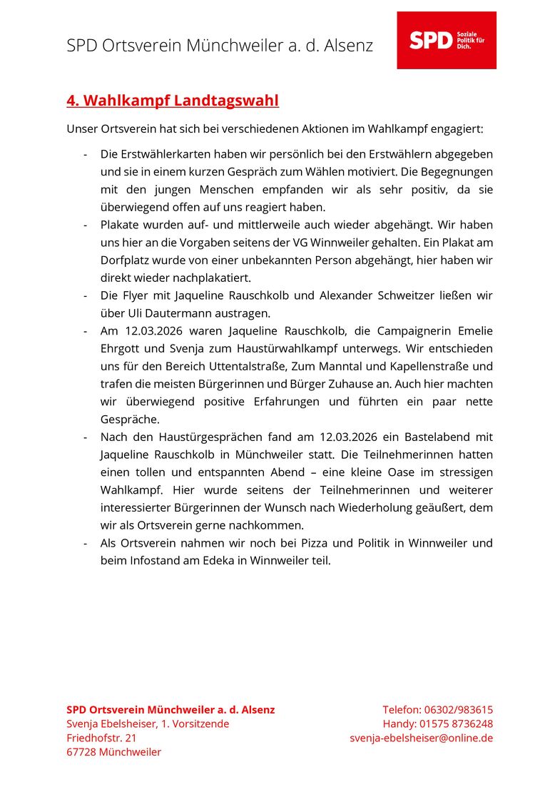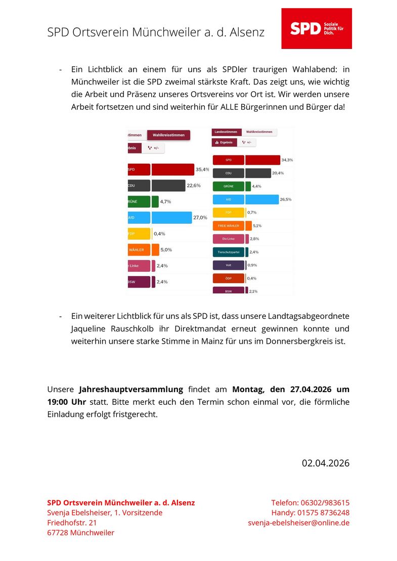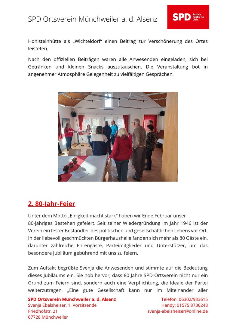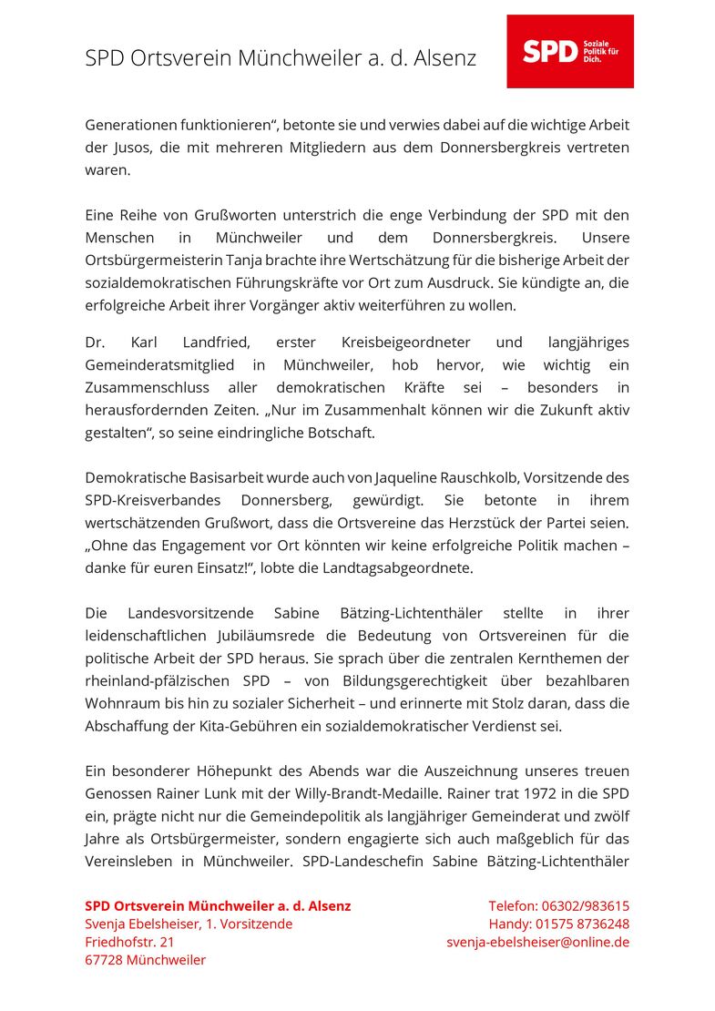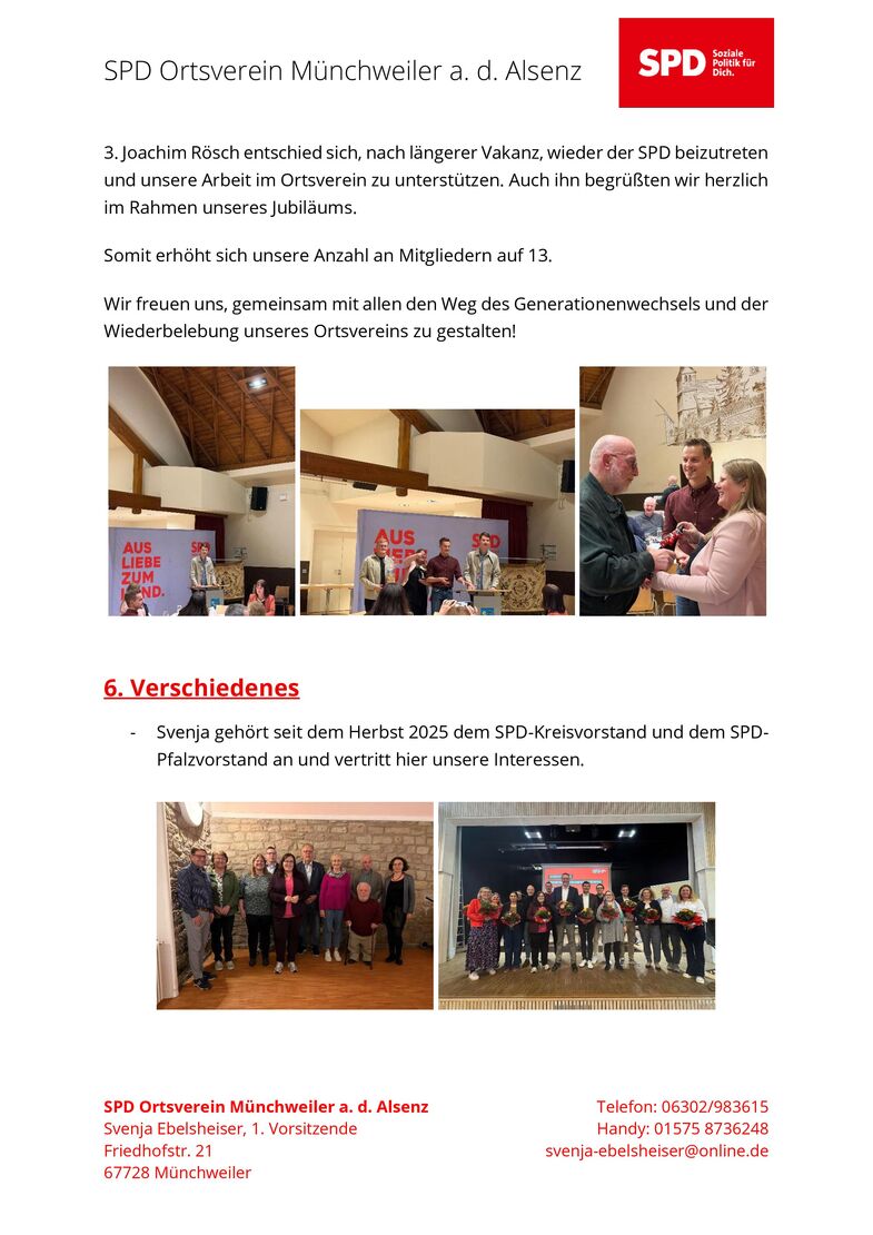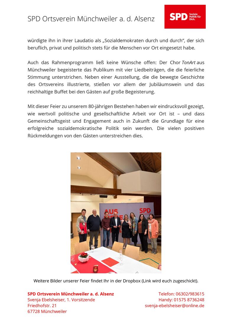 Mit der Feier zu seinem 80-jährigen Bestehen hat der SPD-Ortsverein Münchweiler eindrucksvoll gezeigt, wie wertvoll politische und gesellschaftliche Arbeit vor Ort ist – und dass Gemeinschaftsgeist und Engagement auch in Zukunft die Grundlage für eine erfolgreiche sozialdemokratische Politik sein werden.