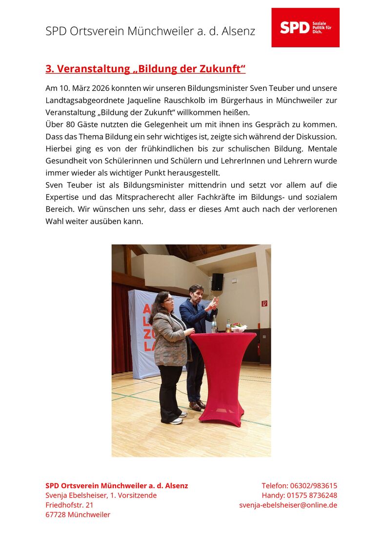 Am 10. März 2026 konnten wir unseren Bildungsminister Sven Teuber und unsere Landtagsabgeordnete Jaqueline Rauschkolb im Bürgerhaus in Münchweiler zur Veranstaltung „Bildung der Zukunft“ willkommen heißen.
