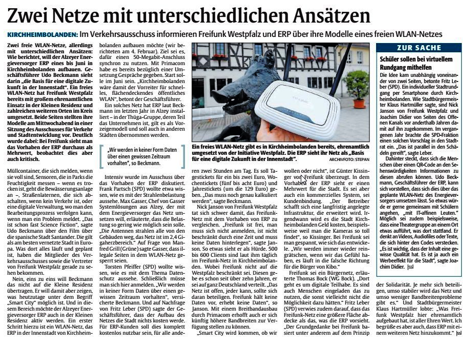 Auf Antrag unserer SPD-Fraktion im Stadtrat beschäftigte sich der "Ausschuss für Verkehr und Stadtentwicklung" mit dem Thema "Freies WLAN". Nachstehend ein Bericht über die Sitzung aus der RHEINPFALZ, Lokalredaktion Kirchheimbolanden, vom 17. Februar 2017.