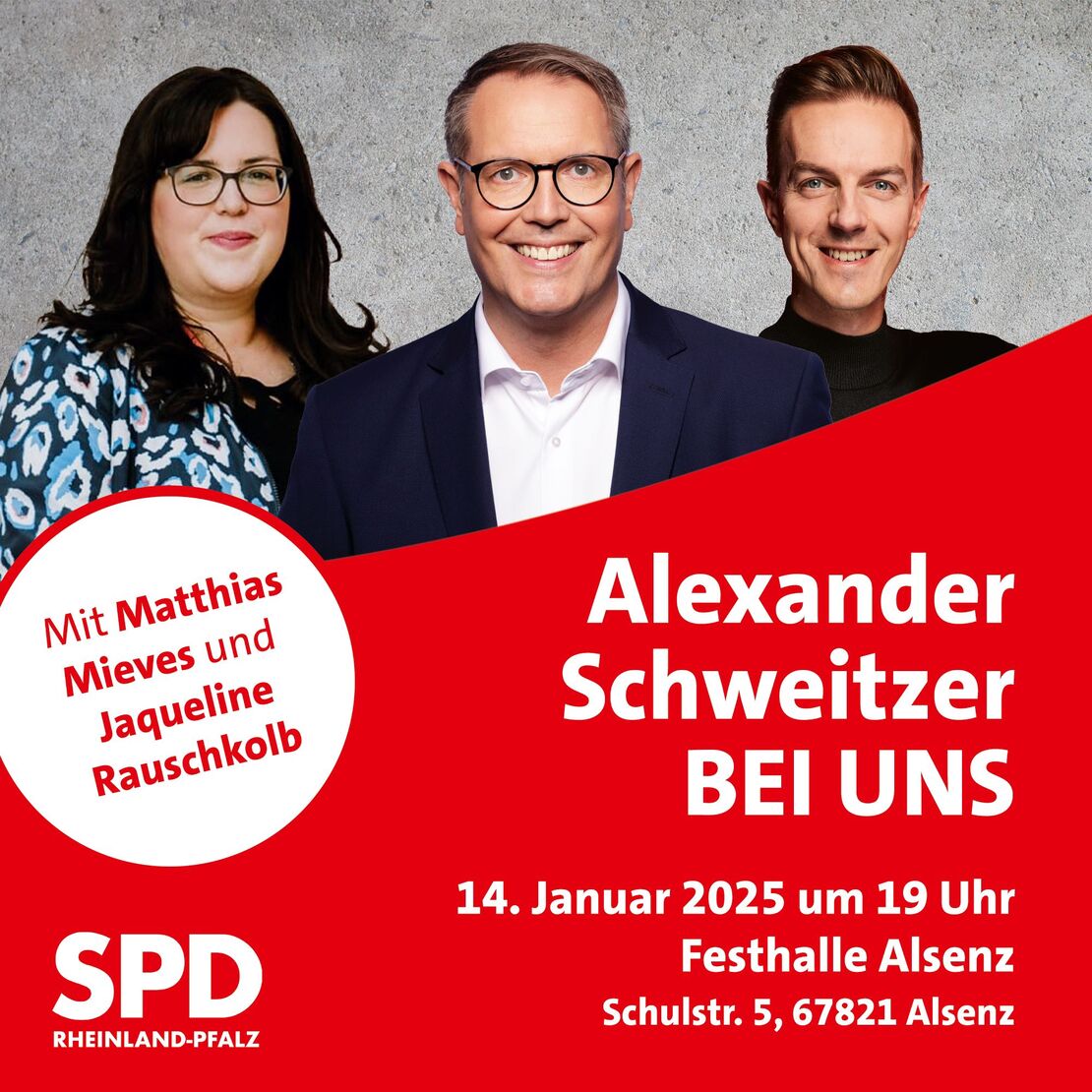 Am 14. Januar 2025 um 19 Uhr ist Alexander Schweitzer, Mitglied des Bundesrates, zu Gast in der Festhalle Alsenz, Schulstraße 5.