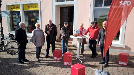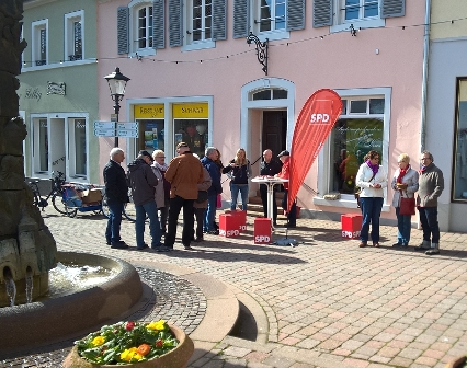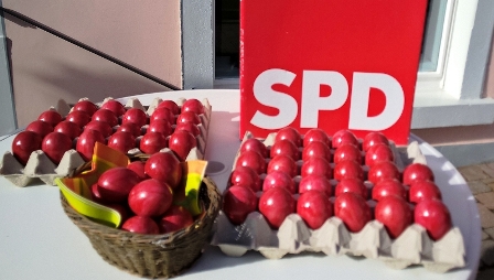Frühlingshaftes Wetter und gute Gespräche beim Verteilen "Roter Eier" am Mozartbrunnen.
