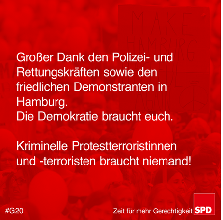 Die Bilder aus Hamburg sind erschütternd. Sie machen jeden und jede DemokratIn wütend. Die Polizistinnen und Polizisten haben unter schwierigsten Umständen buchstäblich Leib und Leben riskiert, um unseren Rechtsstaat zu verteidigen.