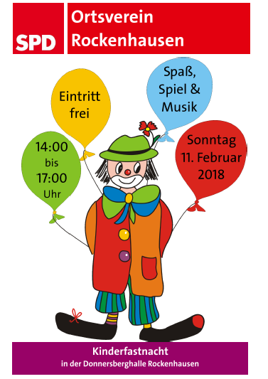Viel Spiel, Spaß und Musik in Rockenhausen. Für Kinder, Eltern und Großeltern. Der SPD Ortsverein Rockenhausen veranstaltet am Sonntag den 11. Februar wieder seine traditionelle Kinderfastnacht. Kinder, Eltern und Großeltern sind herzlich von 14:00-17:00 zur Kinderfastnacht nach Rockenhausen in die Donnersberghalle eingeladen. Der Eintritt ist frei und die Kinder erwartet viel Spaß und Musik.