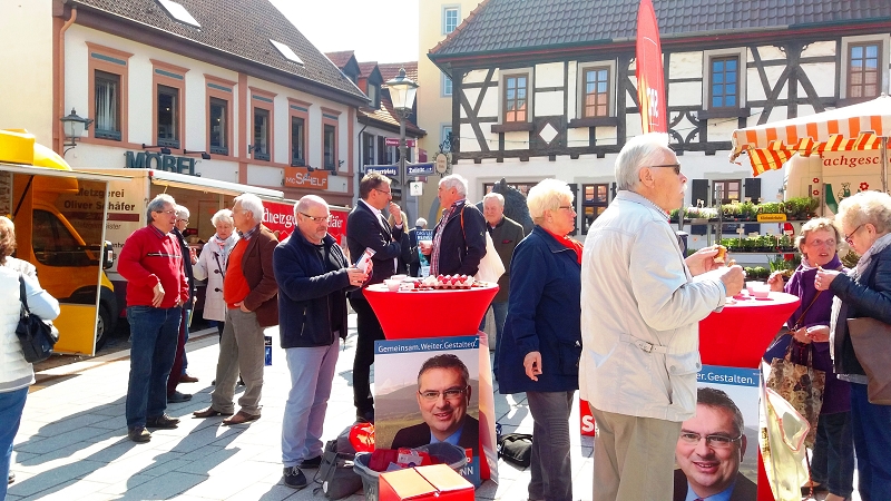 Gemeinsam mit dem SPD-Ortsverein Kirchheimbolanden lud Michael Cullmann zum Marktfrühstück auf den Römerplatz ein. Bei strahlendem Sonnenschein nutzten viele die Gelegenheit zum Einkaufen an den Ständen.