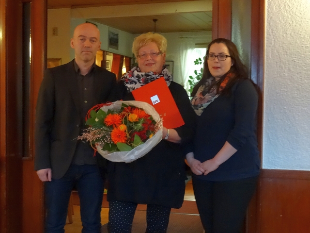 Monika Sandmeier ist ein sehr aktives und engagiertes Mitglieder in der SPD Kirchheimbolanden, so Vorsitzender Müller. Sie organisiert die Seniorenarbeit mit regelmäßigen Treffen und Gestaltung von Themenmittagen. Aber auch bei anderen Veranstaltungen der SPD Kirchheimbolanden ist sie präsent und arbeitet mit, sei es bei Picknick im Park oder bei Info-Ständen. Fast 25 Jahre ist Monika Sandmeier auch für die SPD im Stadtrat. Ebenso ist sie in verschiedenen Organisationen und Vereinen der Stadt ehrenamtlich aktiv. Jaqueline Rauschkolb freute sich, einem so engagierten Mitglied die Urkunde und Nadel für 25 Jahre überreichen zu können.