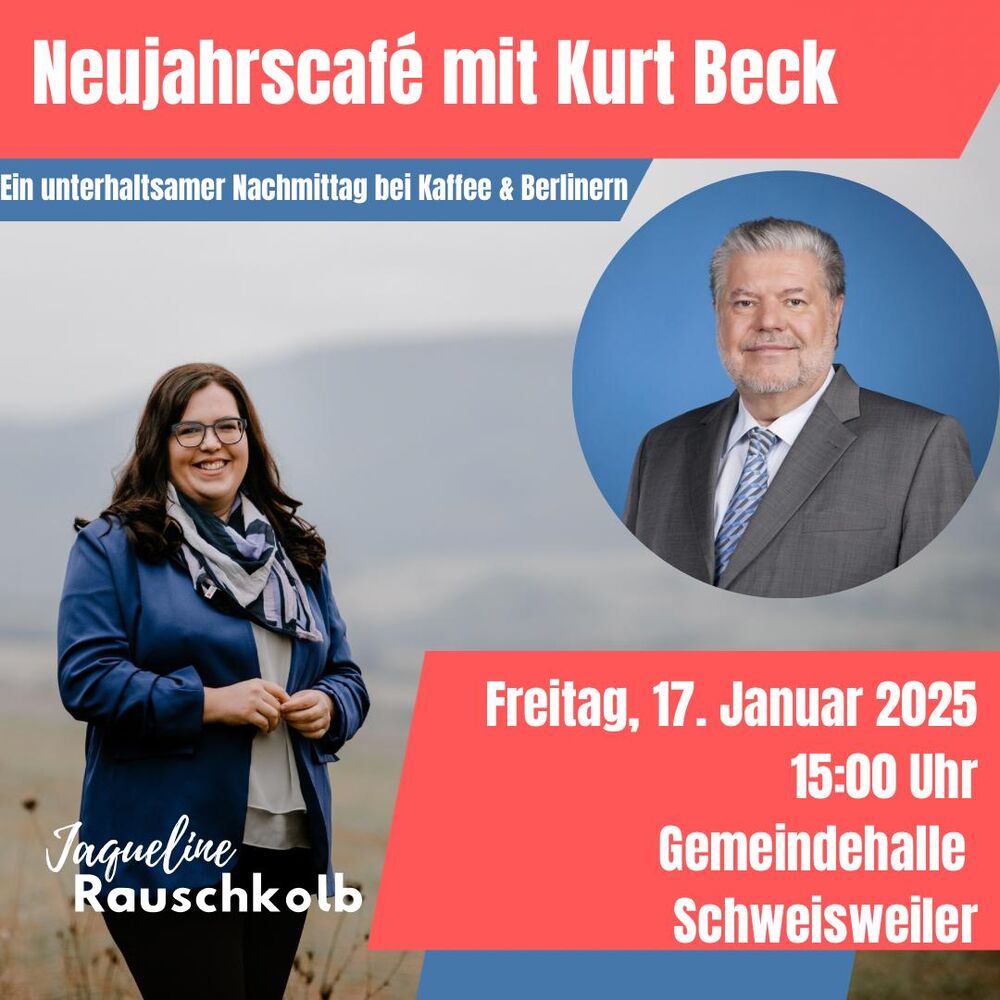 Jaqueline Rauschkolb lädt herzlich zum Neujahrscafé mit dem ehemaligen Ministerpräsidenten Kurt Beck, am Freitag den 17. Januar ab 15 Uhr nach Schweisweiler in die Gemeindehalle ein. Es soll ein unterhaltsamer Nachmittag mit Café und Berlinern werden.
