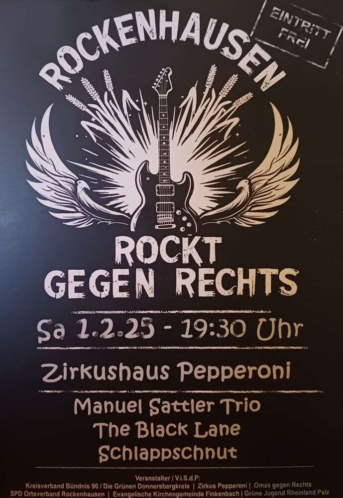 Am 01. Februar 2025 findet im Zirkushaus Pepperoni in Rockenhausen die Veranstaltung „Rockenhausen rockt gegen Rechts“ statt.