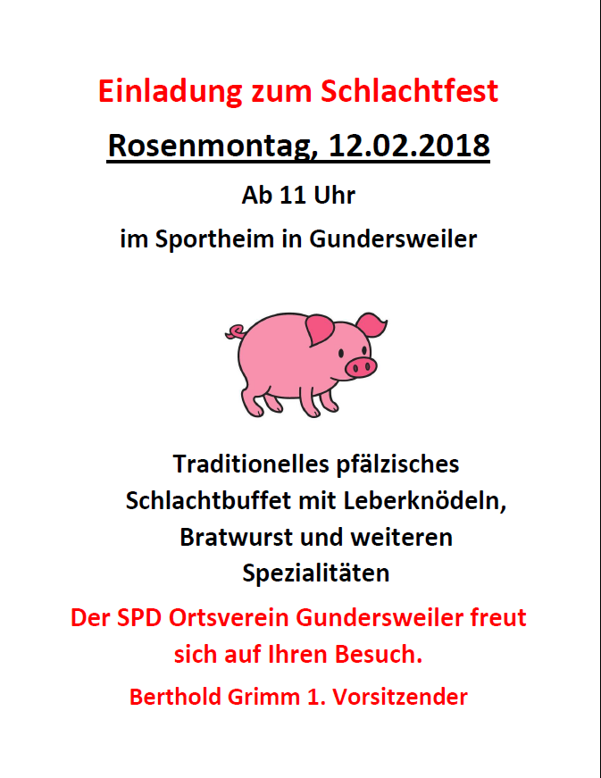 Der SPD Ortsverein Gundersweiler lädt herzlich zum traditionellen pfälzischen Schlachtfest am Rosenmontag den 12. Februar 2018 ein. Neben Leberknödel und Bratwurst gibt es weitere leckere Spezialitäten. Beginn ist um 11 Uhr im Sportheim in Gundersweiler.