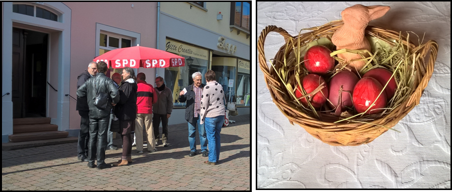 Am Ostersamstag verteilten - wie schon seit Jahren - Mitglieder unseres Ortsvereins rote Ostereier in der Innenstadt von Kirchheimbolanden. Neben der scherzhaft gemachen Bemerkung "ist denn immer noch Wahlkampf?" erhielten wir sehr positive Rückmeldungen zu dieser Aktion: Gute Gespräche über das Landeswahlergebnis, Anregungen zur Stadtpolitik, Anerkennung, dass wir auch außerhalb von Wahlzeiten Kontakt mit Bürger/Innen halten. Für uns ein Ansporn, auch weiterhin das Gespräch mit den Menschen zu suchen.