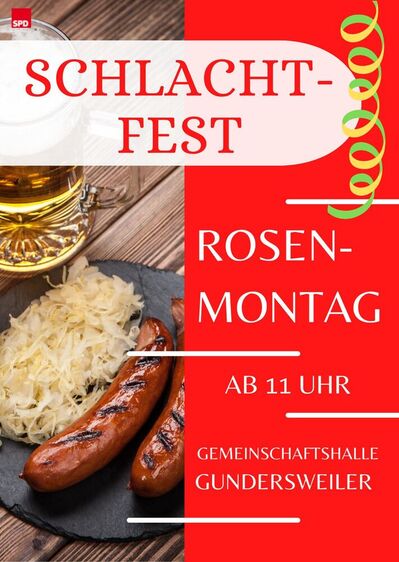 am Rosenmontag, den 3. März 2025, lädt der SPD Ortsverein Gundersweiler herzlich zu einem traditionellen Schlachtfest in der Gemeinschaftshalle in Gundersweiler ein.