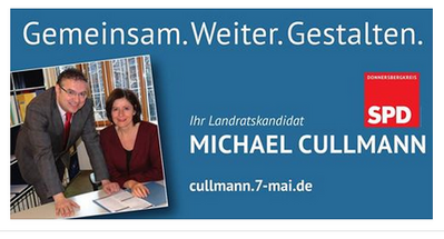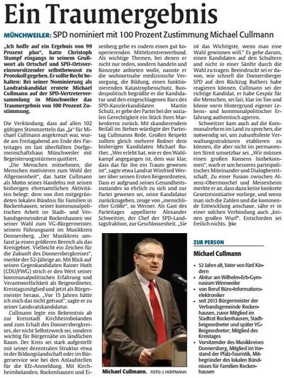 Gestern Abend wurde der VG Bürgermeister aus Rockenhausen Michael Cullmann auf der Vertreterversammlung der Donnersberger SPD mit sagenhaften 100% (eine Ungültige) zum neuen Landratskandidaten der Donnersberger SPD gewählt.
