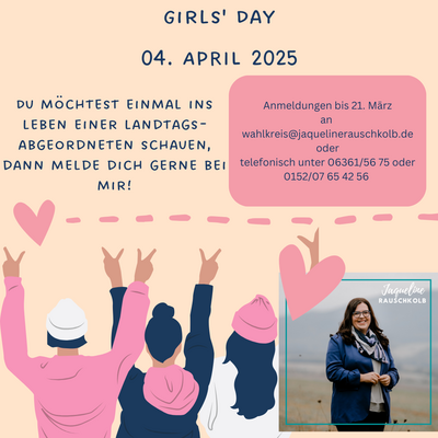 „Die Zukunft gehört Dir!“: Unter diesem Motto steht der diesjährige GirlsDay am 3. April 2025, an dem sich auch die SPD-Landtagsfraktion Rheinland-Pfalz wieder intensiv beteiligt. An diesem Tag eröffnen die Abgeordneten der Fraktion Mädchen ab 14 Jahren die Möglichkeit, Parlamentsluft zu schnuppern und alles über Politik zu fragen, was man schon immer wissen wollte. Mädchen aus dem Donnersbergkreis können sich dafür ab sofort bei der SPD-Landtagsabgeordneten Jaqueline Rauschkolb bewerben, um am 3. April in Mainz einen ausführlichen Blick hinter die Kulissen des Landtags zu werfen, mit vielen Politikerinnen und Politikern ins Gespräch zu kommen und an einem spannenden Programm teilzunehmen.