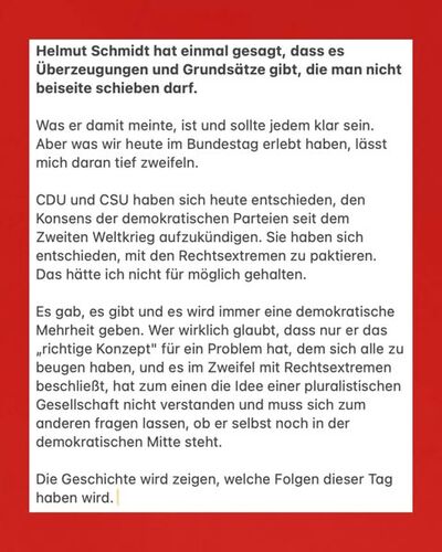Was heute im Bundestag passiert ist, ist eine Zäsur ohne Wenn und Aber. Friedrich Merz und die Union haben sich für den Schulterschluss mit den Rechtsextremen entschieden. Die Union macht sich damit zum Steigbügelhalter.