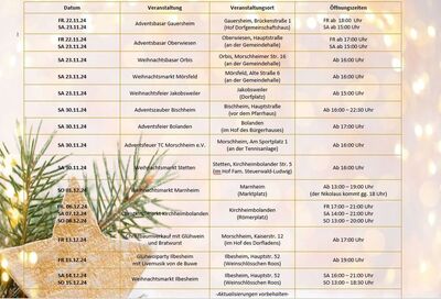 Verbandsgemeinde Kirchheimbolanden: "Die besinnliche Weihnachtszeit steht vor der Tür und wir möchten euch gerne wieder über die bevorstehenden Weihnachtsmärkte in unserer Verbandsgemeinde informieren. Hier ist unser Kalender, damit ihr keine der festlichen Veranstaltungen verpasst"