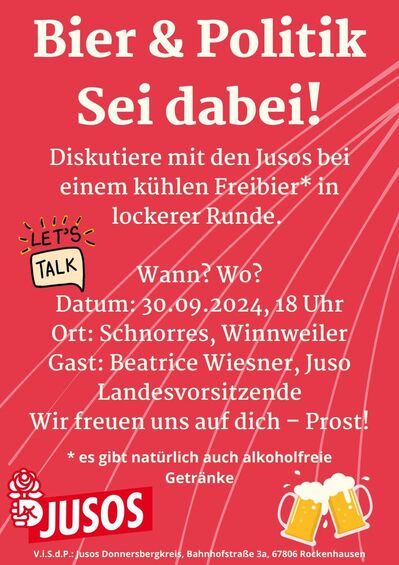 Als Gast kommt Beatrice Wiesner, unsere Juso Landesvorsitzende vorbei. Diskutiert mit den Jusos über die aktuellen Herausforderungen unserer Politik.