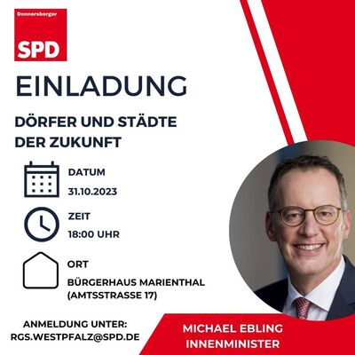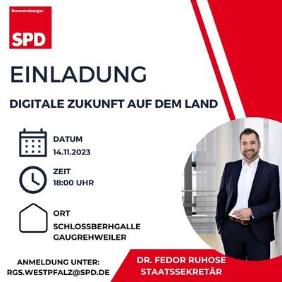 Die Donnersberger SPD lädt alle interessierten Bürgerinnen und Bürger am 14.11.2023 um 18 Uhr herzlich zum Thema "Digitale Zukunft auf dem Land" nach Gaugrehweiler in die Schlossberghalle ein. Als Experte wird Dr. Fedor Ruhose, Staatssekretär referieren.