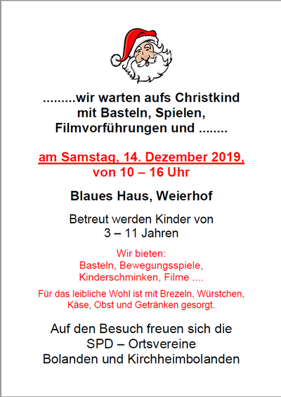 Schon seit vielen Jahren bieten die SPD- Ortsvereine Bolanden und Kirchheimbolanden die Veranstaltung „…wir warten aufs Christkind“ an. Am Samstag, 14. Dezember 2019 ist es wieder soweit. Es wird ein buntes Programm den Kindern die Wartezeit auf Weihnachten verkürzen. Von 10 bis 16 Uhr können die Kinder im Blauen Haus, Weierhof, basteln, spielen und schminken, außerdem wartet noch die eine oder andere Überraschung auf die kleinen Gäste.