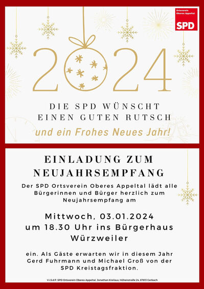 Der SPD Ortsverein Oberes Appeltal lädt am Mittwoch, den 03.01.2024 um 18:30 zum Neujahrsempfang ins Bürgerhaus Würzweiler ein.