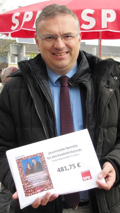 Landratskandidat Michael Cullmann überreichte dem Bürgermeister der Verbandsgemeinde Bernd Frey eine Spende über 481,75 € für den Kinderkrebsfonds der Verbandsgemeinde Eisenberg. Die Spenden wurden anlässlich der Wahlkampfveranstaltung "Kaffeeklatsch mit Malu und Michael" mit Ministerpräsidentin Malu Dreyer in Eisenberg gesammelt. Allen Spenderinnen und Spendern sagen wir herzlichen Dank! Vielen Dank an alle aus Eisenberg, Kerzenheim und Ramsen, die geholfen haben diese tolle Veranstaltung mit vielen Besuchern vorzubereiten, durchzuführen und abzuräumen. Danke auch für die vielen gespendeten leckeren Kuchen und für den gespendeten Kaffee!