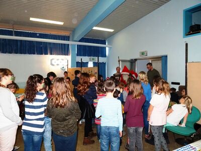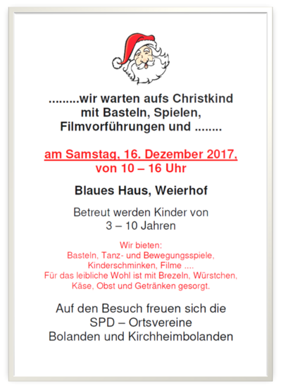 Nicht mehr wegzudenken im Terminkalender ist die Veranstaltung „...wir warten aufs Christkind“ am letzten Samstag vor Weihnachten im Blauen Haus, Weierhof. Viele Kinder folgten der Einladung der SPD–Ortsvereine Bolanden und Kirchheimbolanden. Ausgestattet mit einem Namensbutton, stürzten sie sich ins Geschehen. Nun fiel die Entscheidung schwer – was mache ich als erstes? Basteln, Spielen oder auf den ersten Kinderfilm warten? Beim Basteln konnten die Kinder zwischen den unterschiedlichsten Bastelangeboten auswählen. Fünf Basteltische luden zum Mitmachen ein. Mit Unterstützung von vielen Helferinnen und Helfern wurde den ganzen Tag über ausgeschnitten, geklebt, Weihnachtsmänner gebastelt und Weihnachtsgestecke gestaltet. Beim Abholen konnten die kleinen Gäste ihre Werke stolz den Eltern oder Großeltern präsentieren.