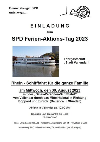 Am Mittwoch, 30. August 2023 heißt es an der Schiffsanlegestelle am Rhein in Vallendar „Leinen los“. Für diesen Tag heuerte die Donnersberger SPD das Personenschiff „Stadt Vallendar“ für eine Schiffstour auf dem Rhein an. Unter dem Motto „Heute geht es an Bord“ lädt die SPD zu einer Schifffahrt für die ganze Familie ein.