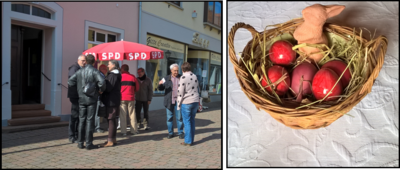Am Ostersamstag verteilten - wie schon seit Jahren - Mitglieder unseres Ortsvereins rote Ostereier in der Innenstadt von Kirchheimbolanden. Neben der scherzhaft gemachen Bemerkung "ist denn immer noch Wahlkampf?" erhielten wir sehr positive Rückmeldungen zu dieser Aktion: Gute Gespräche über das Landeswahlergebnis, Anregungen zur Stadtpolitik, Anerkennung, dass wir auch außerhalb von Wahlzeiten Kontakt mit Bürger/Innen halten. Für uns ein Ansporn, auch weiterhin das Gespräch mit den Menschen zu suchen.