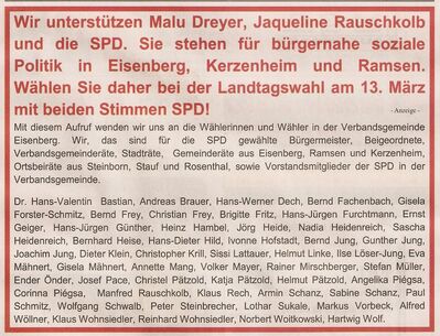 Am Sonntag; Wählen gehen! Mit beiden Stimmen SPD wählen! Malu Dreyer zur Ministerpräsidentin von Rheinland-Pfalz und Jaqueline Rauschkolb als unsere Abgeordnete in den Landtag wählen!
