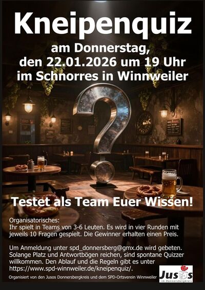 Die JUSOS Donnersbergkreis und der SPD-Ortsverein Winnweiler laden herzlich zum Kneipenquiz im Schnorres in Winnweiler ein.