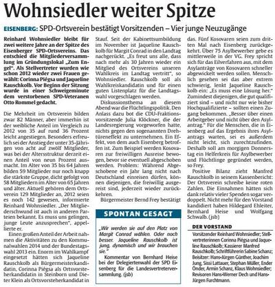 In seinem Rechenschaftsbericht ging Alex Freitag auf die vielfältige Arbeit der letzten zwei Jahre ein und freute sich insbesondere über die ausgewogene Mischung von politischer Arbeit und geselligem Vereinsleben in der Zellertaler SPD. Gustav Herzog konnte als Kassierer über einen guten Kassenstand trotz zweier engagierter Wahlkämpfe berichten.