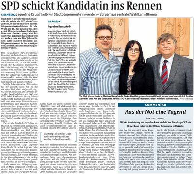 Einstimmig nominierte in einer Mitgliederversammlung der SPD-Ortsverein Jaqueline Rauschkolb auf Vorschlag des Vorstandes als Stadtbürgermeisterkandidatin für Eisenberg bei der Kommunalwahl am 25. Mai 2014.