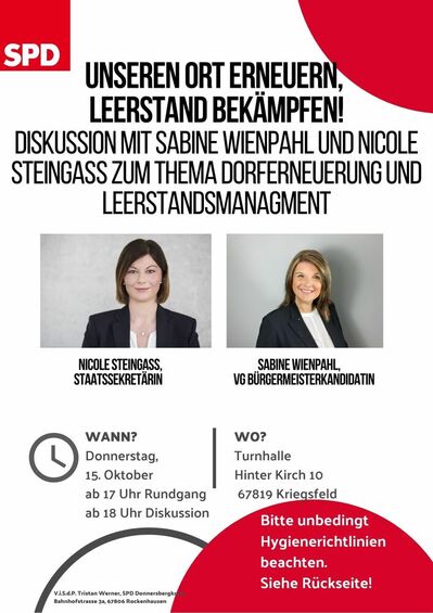 Am Donnerstag den 15.10.2020 wird Nicole Steingaß Staatssekretärin gemeinsam mit Sabine Wiempahl, Bürgermeisterkandidaten für die VG Kirchheimbolanden ab 17 Uhr in Kriegsfeld unterwegs zu einem Ortsgrundgang unterwegs sein. Im Anschluss folgt ab 18 Uhr eine Diskussion zum Thema Dorfentwicklung in der Gemeindehalle in Kriegsfeld.