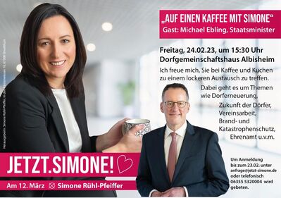 Freitag, 24.02.2023, um 15:30 Dorfgemeinschaftshaus Albisheim. Wir freuen uns, Sie bei Kaffee und Kuchen zu einem lockeren Austausch zu treffen. Dabei geht es um Themen wie Dorferneuerung, Zukunft der Dörfer, Vereinsarbeit, Brand- und Katastrophenschutz, Ehrenamt und vieles mehr. Wir bitten um Anmeldung unter anfrage@jetzt-simone.de oder telefonisch unter 06355 5320004.