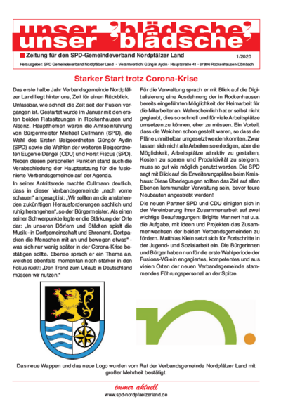 Das neue Blädsche für die Verbandsgemeinde Nordpfälzer Land ist da! Ab heute wird die neue Ausgabe an alle Haushalte im Nordpfälzer Land verteilt. Aufmacher wird dabei ein Bericht über den Start der neuen Verbandsgemeinde Nordpfälzer Land in der Coronakrise sein. Darüberhinaus erwarten euch Beiträge von Jaqueline Rauschkolb sowie Berichte über Ehrungen bei den SPD Ortsvereinen Alsen und Rockenhausen. Viel Spaß beim Lesen!