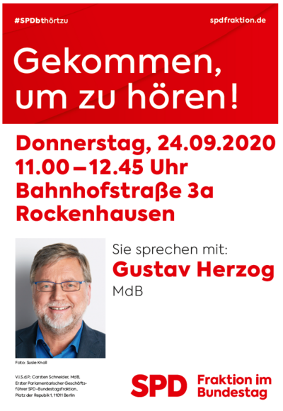 ROCKENHAUSEN: Gustav Herzog, MdB bei der Dialogtour „Gekommen, um zu hören!“ Unter dem Titel "Gekommen um zu hören!" ist die SPD Bundestagsfraktion mit einem Dialogbus in Rockenhausen am 24.09.2020 von 11.00-12.45 Uhr, Bahnhofstrasse 3a vor Ort. Bürgerinnen und Bürgern sind dabei herzlich eingeladen sich mit Gustav Herzog, MdB über aktuelle Themen auszutauschen und sich über die Arbeit der SPD Bundestagsfraktion zu informieren. Die SPD Bundestagsfraktion fährt durch ganz Deutschland, um mit den Menschen ins Gespräch zu kommen und um deren Anliegen direkt vor Ort zu erfahren - natürlich unter Einhaltung der Abstandsregel -, aber doch greifbar für alle Interessierten.