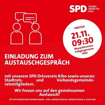 Der SPD-Ortsverein Kibo sowie unsere Mitglieder des Stadt- und Verbandsgemeinderats laden herzlich zu einem offenen Austausch ein. Nutzen Sie die Gelegenheit, Ihre Fragen, Anliegen und Ideen direkt mit uns ins Gespräch zu bringen. Wir freuen uns auf einen angenehmen Dialog und den persönlichen Kontakt.