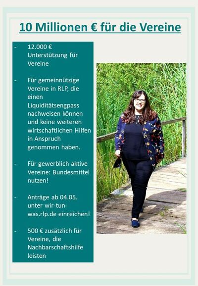 Mit einem Soforthilfe-Programm will die Landesregierung Vereinen unter die Arme greifen, die in Folge der Corona-Pandemie in finanzielle Schieflage geraten sind. Dies teilt die Landtagsabgeordnete Jaqueline Rauschkolb mit. Das Landesprogramm wurde heute in Mainz vorgestellt. Vereine in finanzieller Not können mit einem Landeszuschuss von bis zu 12.000 Euro rechnen.
