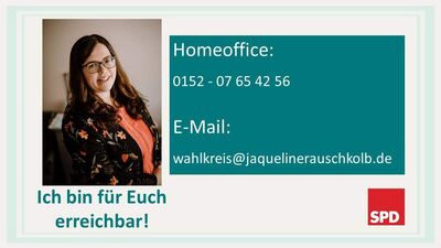 Unsere Abgeordnete Jaqueline Rauschkolb ist auch in schwierigen Zeiten für Sie da! Bei Problemen, Fragen und Anregungen können Sie sich gerne unter 0152-07 65 42 56 oder unter wahlkreis@jaquelinerauschkolb.de melden.