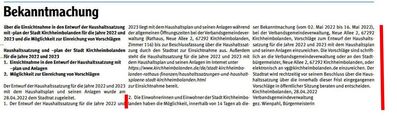 Leider veröffentlichen wir diese Möglichkeit reichlich spät - aber evtl. hat jemand noch einen guten Vorschlag, der in den Haushaltsentwurf mit eingebracht werden soll. Die Entscheidung fällt schon der in Stadtratssitzung am 19.Mai unter Punkt 3 der Tagesordnung. Sitzungsbeginn 19 Uhr, Sitzungsort Ratssaal des Rathauses in Kirchheimbolanden.