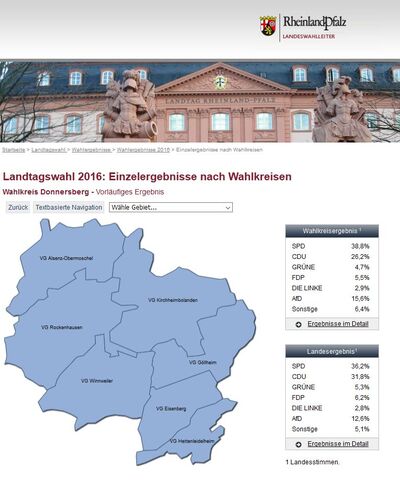Die Ergebnisse des Donnersbergkreises, seiner Verbands- und Ortsgemeinden findet man hier http://www.wahlen.rlp.de/…/…/2016/gebiete/4390000000000.html