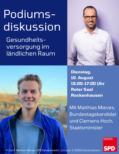 Wir möchten Sie herzlich zu unserer Podiumsdiskussion „Gesundheitsversorgung im ländlichen Raum“ mit Clemens Hoch, Staatsminister für Gesundheit einladen. Unter anderem sollen die Themen Ärztemangel auf dem Land, Medizinische Versorgungszentren und die Zukunft des Krankenhausstandortes Rockenhausen diskutiert werden. Die Veranstaltung findet am Dienstag, 10. August von 15 – 17 Uhr im Roten Saal in Rockenhausen statt. Wir freuen uns über eine rege Teilnahme. Fragen können Sie uns gerne bereits im Vorfeld bis Freitag den 06. August unter info@matthiasmieves.de zukommen lassen.
