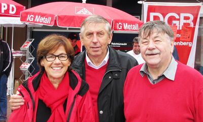 Wahlkampf zur Bundestagswahl ab 5 Uhr früh: Vor dem Werkstor von Gienanth verteilten wir mit MdB Gustav Herzog Pfälzer Äpfel und Wahlkampfzeitungen an die Früh- und an die Nachtschicht der Eisenberger Gießerei. Mit dabei waren Betriebsratsvorsitzender Thomas Brunck, Walter Brauer, Bernhard Heise, Ender Önder, Jaqueline und Michelle Rauschkolb, sowie Reinhard Wohnsiedler.