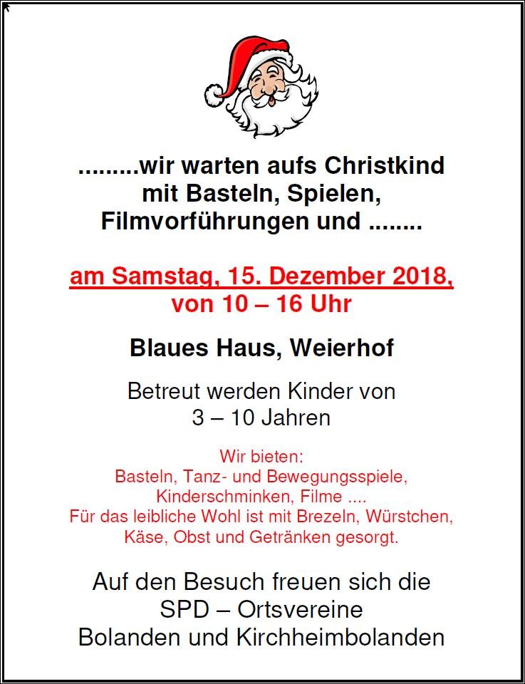 Schon seit vielen Jahren bieten die SPD- Ortsvereine Bolanden und Kirchheimbolanden die Veranstaltung „…wir warten aufs Christkind“ an. Am Samstag, 15. Dezember 2018, ist es wieder soweit. Es wird ein buntes Programm den Kindern die Wartezeit auf Weihnachten verkürzen. Von 10 bis 16 Uhr können die Kinder im Blauen Haus, Weierhof, basteln, spielen, tanzen und schminken, außerdem wartet noch die eine oder andere Überraschung auf die kleinen Gäste.